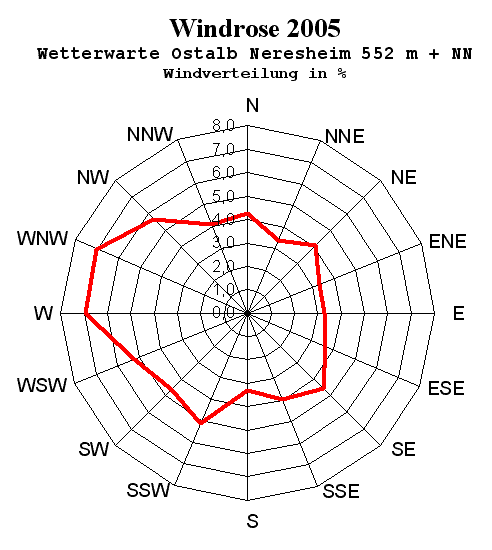Höchste Windgeschwindigkeit: 94 km/h am 12.02.2005